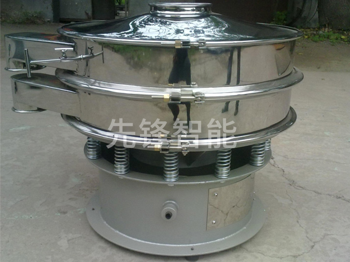 本機(jī)由料斗、振蕩室、聯(lián)軸器、電機(jī)組成。振蕩室內(nèi)有偏心輪、橡膠軟墊、主軸、軸承等組成.可調(diào)節(jié)的偏心重錘經(jīng)馬達(dá)驅(qū)動(dòng)傳達(dá)到主軸中心線,在平衡狀態(tài)下,產(chǎn)生離心力,使物料強(qiáng)度改變在篩內(nèi)形成軌道旋渦。重錘調(diào)節(jié)器的振幅大小可根據(jù)不同物料和篩網(wǎng)進(jìn)行調(diào)整。